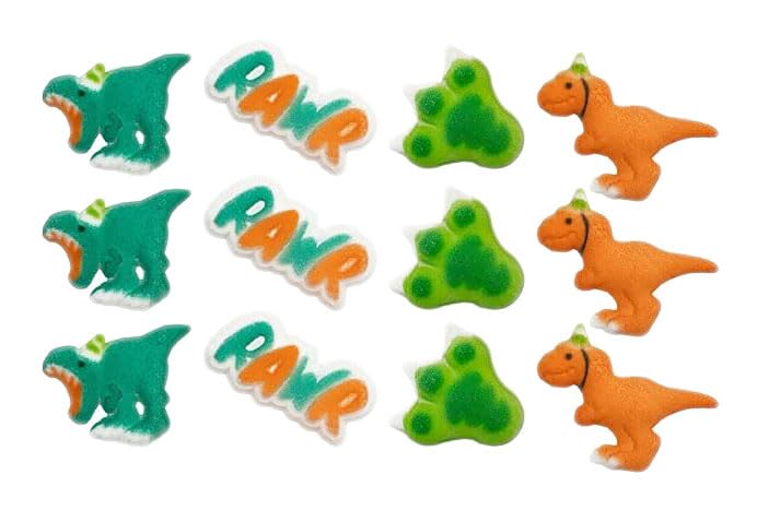 Green, Orange, and White Dinosaur Party Edible Sugar Cake Toppers, 12 Count