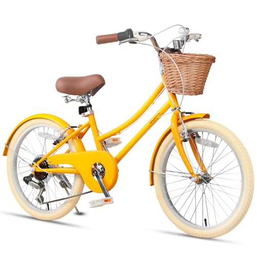 Glerc 20 Inch Beach Cruiser Bike, 6-Speed Hybrid City Bicycle for Girls Youth and Over 6 Years Old, Missy Bike with Wicker Basket & Lightweight, Yellow