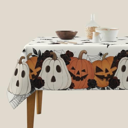 Aytipun Halloween Rectangle Tablecloth 60x84 Inch Burnt Orange Cream White Pumpkin Dark Black Rose Floral Holiday Themed Decorative Table Cloth Farmhouse for Indoor Party Kitchen Dinner Picnic Decor