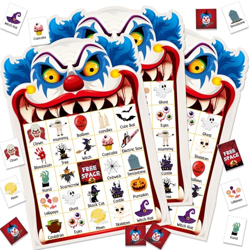 Blosssound Halloween Clown Bingo Game – 24 Players Bingo Cards with Call Card & Marker Sheets – Spooky Halloween Party Games, Classroom Activities, Fall Carnival Prizes, Trick or Treat Fun