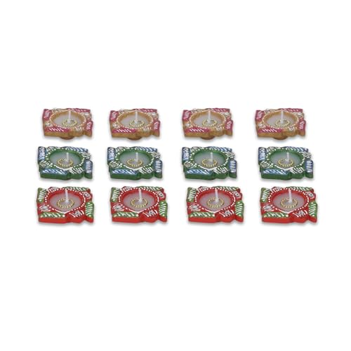 4OUR FAITH 12 Pc Multicolor Handmade Terracotta Swastik Wax Filled Diya Set | Decorative Oil Lamps for Diwali Pooja | Unique Indian Gift Item | Perfect for Thanksgiving Celebrations