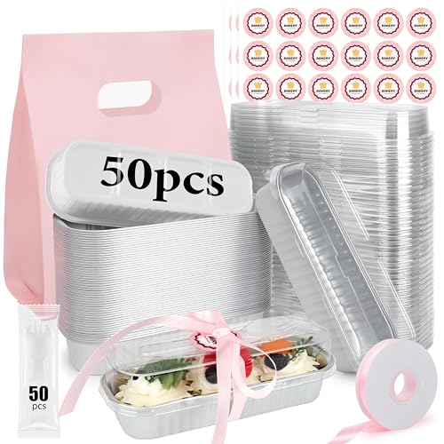 OcePor 50 Pack Mini Loaf Pans With Lids,Mini Cake Pans With Lids and Spoons,6.8oz Bread Loaf Pans Disposable,Small Aluminum Cake Tins,Baking Pans Individual (White)