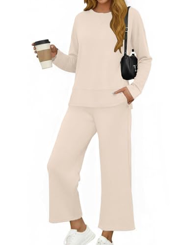 Glamaker Lounge Sets for Women 2 Piece Outfits Fall Long Sleeve Pullover Tops Long Pants Casual Sweatsuits Tracksuit Sets with Pockets Apricot S