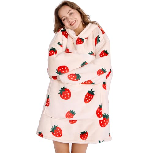 Aemilas Strawberry Blanket Hoodie for Women & Men, Gift Ideas - Comfort Sherpa & Flannel Wearable Blanket Sweatshirt for Adult and Teens, One Size, Beige