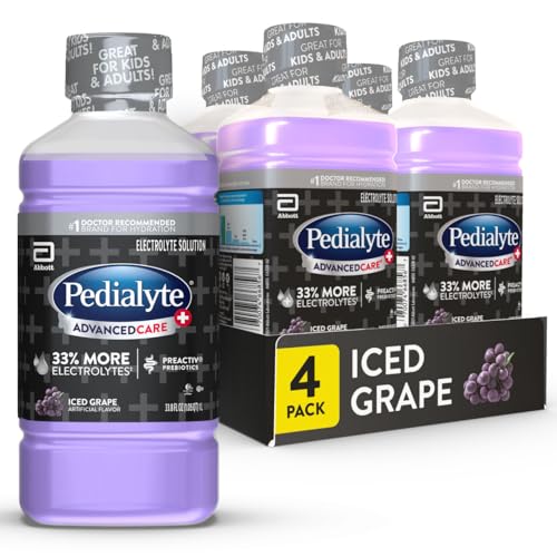 Pedialyte AdvancedCare Plus Electrolyte Hydration Drink, Has 33% More Electrolytes and Has PreActiv Prebiotics, Iced Grape, 1 Liter, Pack of 4