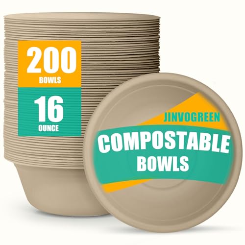 JINVOGREEN 200 Count 16 oz Paper Bowls, Disposable Compostable Bowls, Heavy Duty Biodegradable Sugarcane Bagasse Bowl for Breakfast, Salad, Fruits, Desserts, Natural