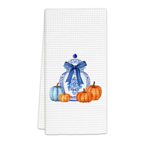 FIicy Chinoiserie Fall Pumpkin Kitchen Towels, Blue and White Porcelain Pumpkin Dish Towels, Blue Pumpkin Bow Decorative Hand Towels for Bathroom, Chinoiserie Fall Bathroom Kitchen Decor(16x24 Inch)