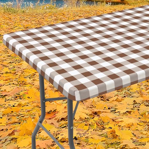 Smiry Rectangle Picnic Table Cloth, Elastic Waterproof Fitted Vinyl Tablecloths, Flannel Backed Buffalo Plaid Table Covers for Dining, Camping, Outdoor (White and Brown, 30" x 60")