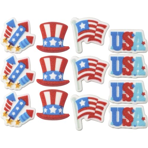 Red, White, and Blue Assortment - Fireworks, Flag, Hat, and USA Edible Sugar Cake Toppers, 12 Count