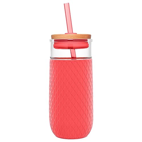 Ello Devon Glass Tumbler with Splash Proof Wooden Lid and Straw, Protective No Sweat Silicone Sleeve, Perfect for Smoothies and Iced Coffee, BPA Free, Dishwasher Safe, 18oz