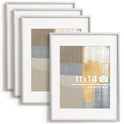 11x14 inch Metal Picture Frame - 11 x 14 Thin Aluminum Photo Frames with 8x10 Removable Mat - High Definition Plexiglass - Vertical and Horizontal Display - Wall Hook Hanging Hardware Included - Silver, Set of 4
