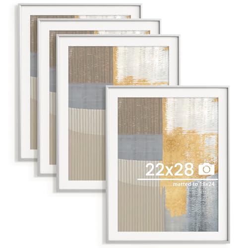 22x28 inch Metal Poster Frame - 22 x 28 Thin Aluminum Picture Frames Matted for 18x24 Photos, Artworks, Prints, Puzzle - High Definition Plexiglass - Vertical and Horizontal Display - Wall Hook Hanging Hardware Included - Silver, Set of 4