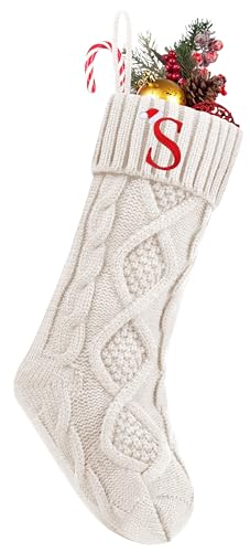Personalized Christmas Stockings with Initials, 18 Inches Large Embroidered Monogrammed Cable Knit Christmas Stocking for Family, Xmas Holiday Party Gifts & Decoration for Fireplace(White,Letter S)
