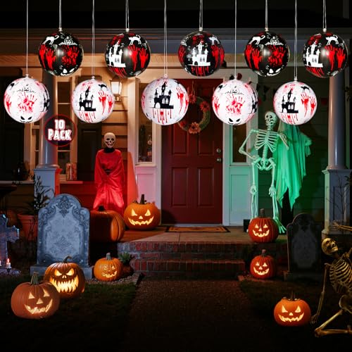 10 PCS 11.8 inch Hanging Halloween Decorations Ball Set, Inflatable Hanging Halloween Ornament Balls with Bloody Handprints, Haunted Castles, Creepy Faces, Black Cats and Pumpkin for Yard,Party Decor