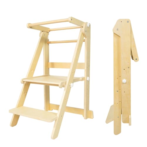 Foldable Toddler Learning Standing Tower, WOOD CITY Montessori Kitchen Step Stool Helper with 3 Adjustable Heights Learning Kitchen Tower for Counter and Bathroom Sink (Natural)