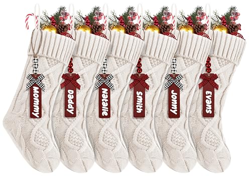 6Pack Personalized Christmas Stockings with Wooden Name Tags, 18 inches Xmas Cable Knitted Stocking for Holiday, Hanging Decoration Gifts for Family Party(White)