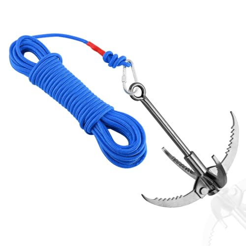 Ant Mag Grappling Hook Stainless Steel Claw Carabiner with 20m/65ft 6mm Auxiliary Blue Rope for Camping Hiking Tree Grabbing and Water Lifting Salvage