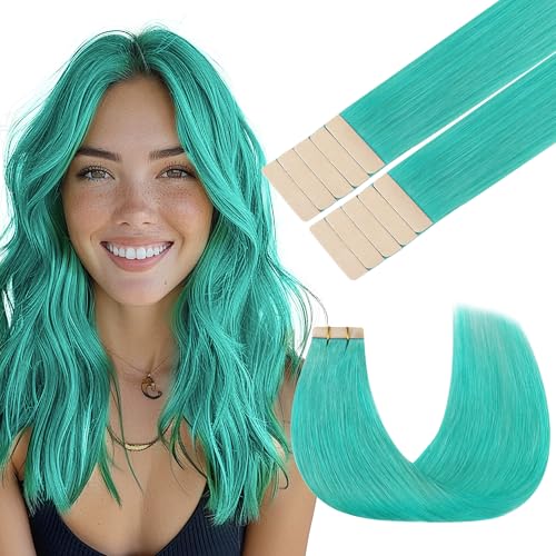 GOO GOO Tape in Hair Extensions Human Hair, Teal Green, 22inch 30g 10pcs, Colored Tape ins Human Hair Extensions, Silky&Soft Invisible Tape Ins, Hair Highlighted for Party