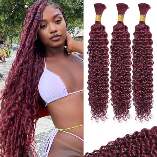 100g 3 bundles 99j Red Burgundy Human Braiding Hair 24 Inch Deep Water Wave Bulk Human Hair for Braiding No Weft 12A Brazilian Virgin Curly Human Hair Extensions for Boho Braids
