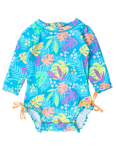 RuffleButts Baby Girls UPF 50+ Sun Protection Floral Printed Long Sleeve One Piece Rash Guard Swimsuit with Zipper - Neon Tiki Vibes, 6-12m