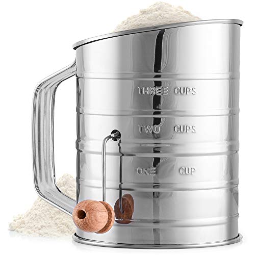 Zulay Kitchen 3 Cup Stainless Steel Flour Sifter - Fine Mesh Rotary Hand Crank Flour Sifter with Agitator Wire Loop For Baking Cakes, Pastries, Pies, Cupcakes and Desserts