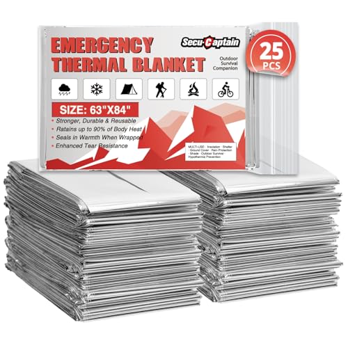 SecuCaptain Survival Emergency Thermal Blankets: 25 Pack Extra Large 84” x63” Space Mylar Blanket Kit for Outdoor Cold Winter Camping Hiking Car Bug Out Bag or First Aid