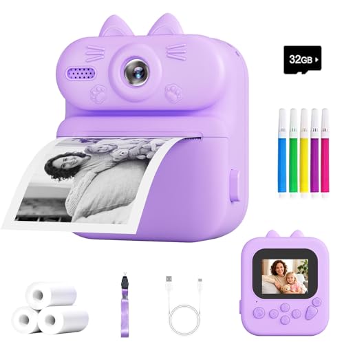Kids Camera Instant Print: Gleeglee 1080P Instant Print Camera for Kids - 32G SD Card - Lanyard - Christmas Birthday Gifts for Girls Boys - Portable Toy for 3 4 5 6 7 8 9 10 Years Old, Purple Cat