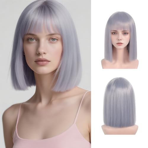 Gray Bob Wig with Bangs Short Gray Straight wig for Women Heat Resistant Synthetic Natural Hair Wig Colorful Bob Wigs for Grils Daily Party Halloween Cosplay Use 13inch