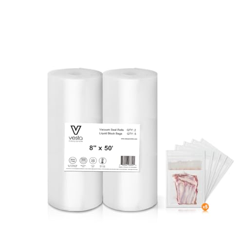 8" x 50' Vacuum Sealer Rolls, 2 Pack with 5 Liquid Block Bags, Perfect for Food Storage, Sous Vide, and Meal Preparation, Lock Fresh and Nutrients