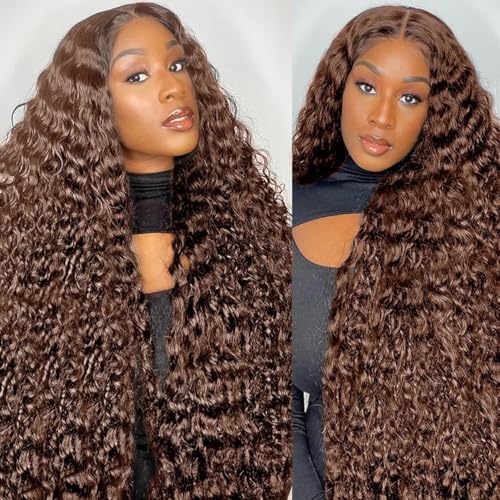 Bworto Chocolate Brown Deep Wave Lace Front Wigs Human Hair 13x6 Hd Lace Curly Lace Frontal Wigs for Black Women Pre Plucked Glueless 4# Brown Colored (34 Inch)