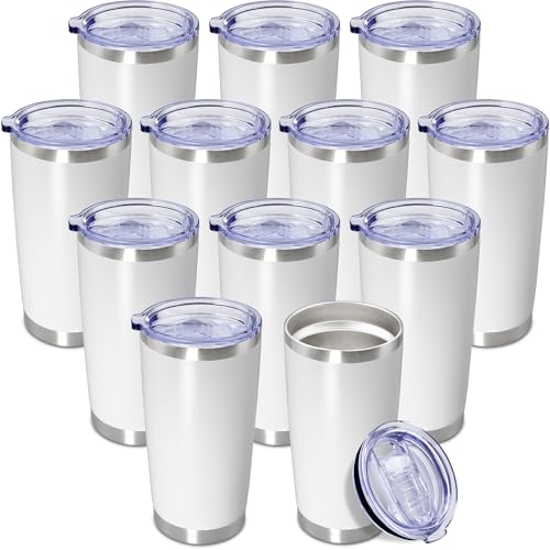 20 oz Tumbler Coffee Travel Tumblers Bulk with Lid Stainless Steel Double Wall Vacuum Insulated Mug Powder Coated Cups fit Car Cupholder for Hot and Cold - White, 12Pack