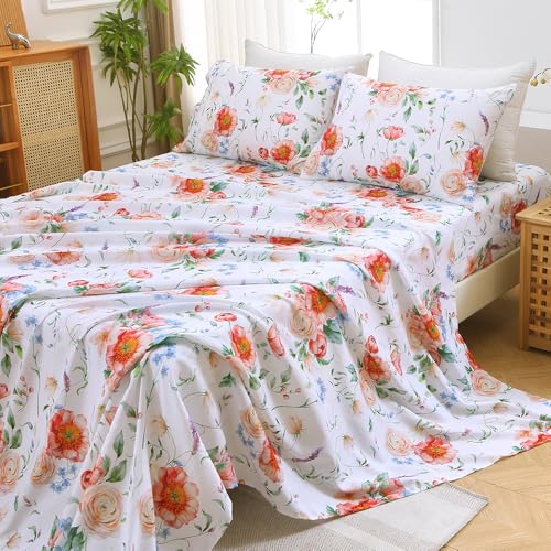 MUXHOMO King Size 4 Piece Sheet Set, Soft & Breathable Sheet Set for Bedroom with Deep Pocket Up to 16", Wrinkle-Free & Cooling Bed Sheets with Flat Sheet, Fitted Sheet & Pillowcases - Blooming Rose