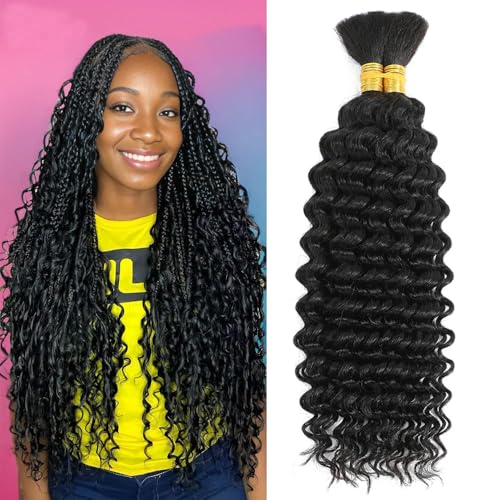 Human Braiding Hair 2 Bundles/Pack 100g Deep Wave Human Bulk Hair for Braiding No Weft 10A Brazilian Virgin Human braiding Hair for Boho Braids Extensions (Natural Color, 26 inch)