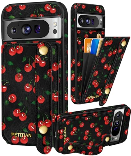 Petitian for Google Pixel 8Pro Case with Wallet - Women Girls Cute Girly Aesthetic Unique Design Leather Credit Card Holder Cardholder Stand Wristband for Pixel 8Pro, Cherry