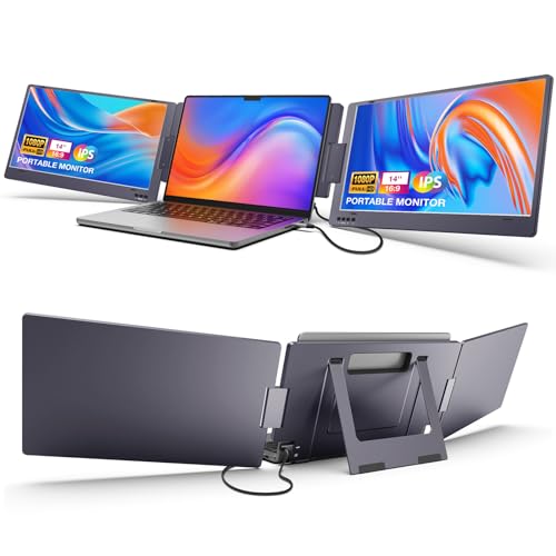 KYY Triple Laptop Monitor Extender, 14" 1080P FHD IPS Dual Portable External Screen, One Cable USB C Travel for 12-16'' Laptop, 210°Rotation & Kickstand, (Space Gray)