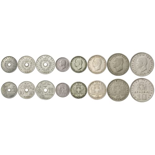 8 Coins from Greece | Greek Coin Set Collection 5 10 20 50 Lepta 1 2 5 10 Drachmai | Circulated 1954-1965 | Paul I | Selene