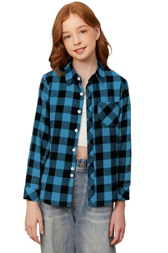 SANGTREE Girls Long Sleeve Button Down Plaid Flannel Shirt Tops for Toddlers and Little Girls Sea Blue Plaid, 7-8 Years = Tag 140