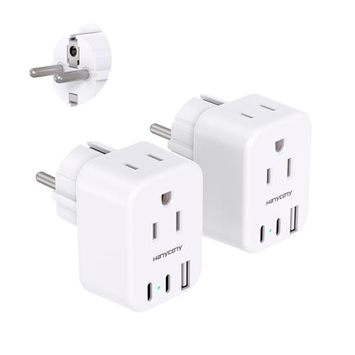 Type E F Plug Adapter, HANYCONY Germany France Travel Plug Adapter with 2 Outlets 3 USB Ports(2 USB C),Schuko Power Adaptor for US to Europe EU Spain Korea Greece Norway German French 2 Pack