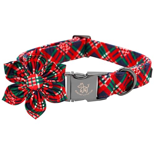 Elegant Little Tail Dog Collar With Red Plaid Christmas Flower, Holiday Pet Collar for X-Large Dogs, Puppy Flower Girl Boy