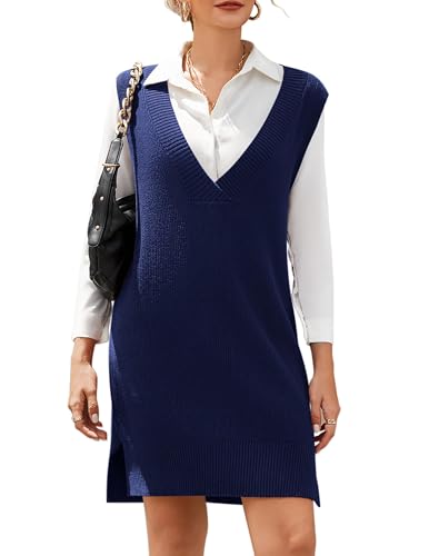 HOTOUCH Womens Sleeveless Sweater Vest Dress Oversized V Neck Casual Loose Knit Side Slit Pullover Short Sweater Dress, Navy Blue Small