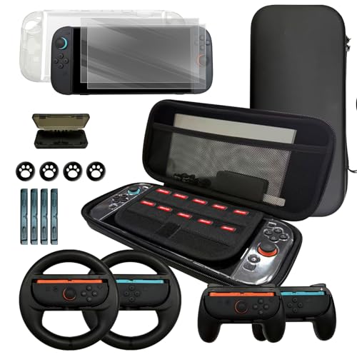 Switch 2 Accessories Bundle 16-in-1: Shockproof Carry Case,2 Pack Tempered Glass Screen Protectors,Ergonomic Grip & Steering Wheel + Protective Cover | Full Protection Kit for Nintendo Switch 2/Switch 1 Console