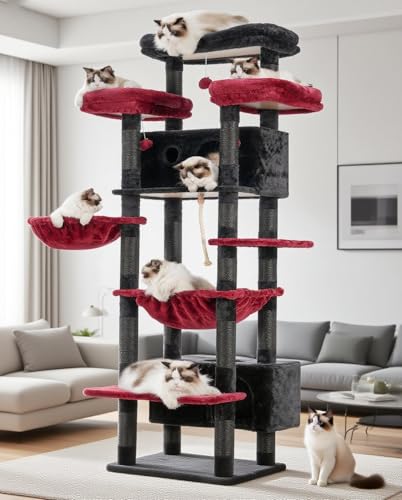 Gitelsnour Cat Tree for Indoor Cats Large Adult, 74" Cat Tower for with 3 Big Platforms, 2 Baskets, 2 Condos, Multi-Level Cat Scratching Posts, Black and Red GCT030BR