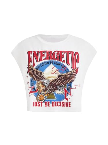 GORGLITTER Women's Graphic Print Cap Sleeve Crop Top Casual Round Neck Short Sleeve T-Shirt White Medium