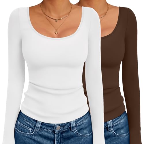 Ekouaer 2 Pack Long Sleeve Shirts for Womens Scoop Neck Tops Slim Fit Undershirt Basic Thermal Tee Shirt Withe/Coffee XS