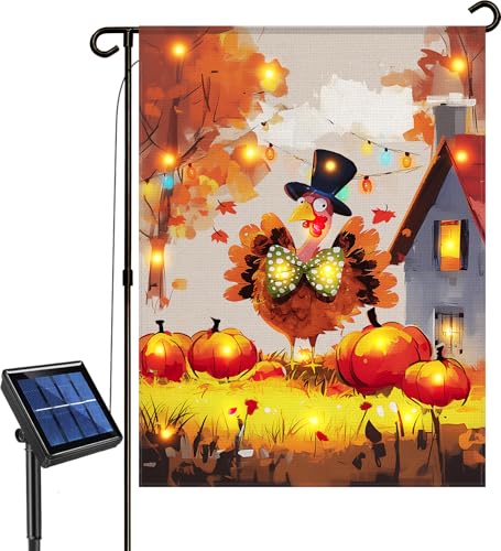 Thanksgiving Lighted Fall Garden Flag, Solar Outdoor Decorative Led Flags Yard Decor, 8 Lighting Modes Led Flag,12x18 Double Sided Turkey Pumpkin Halloween Decorations for Home Porch Outside