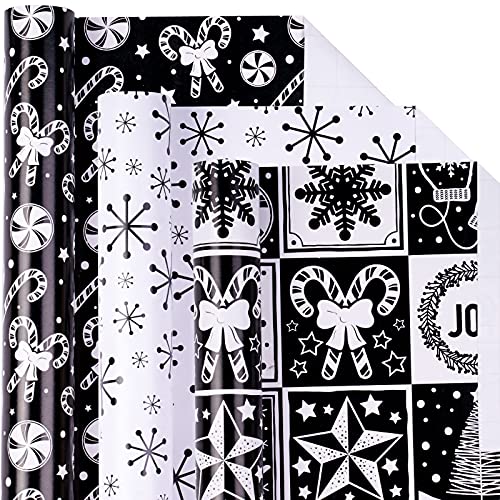 LeZakaa Christmas Wrapping Paper Mini Roll - Bell & Tree/Candy Canes/Snowflakes in Black & White for Gift Wrap, Arts Crafts - 17 x 120 inches - 3 Rolls (42.5 sq.ft.ttl.)