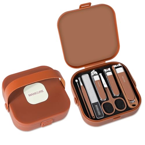Nail Clippers Set for Men and Women 7 Pieces Stainless Steel Grooming Kits, Fingernail and Toenail Clipper Cutters with Luxurious Travel Case Nail Care Tools Manicure Pedicure Kit, Brown