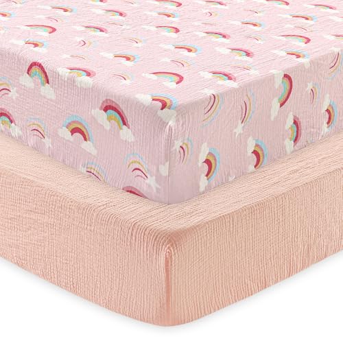 david's kids Muslin Crib Sheets for Girls, 2 Pack 100% Cotton Soft Breathable Fitted Baby Sheet Set, Standard 52"x28" Crib and Toddler Mattress, Rainbow