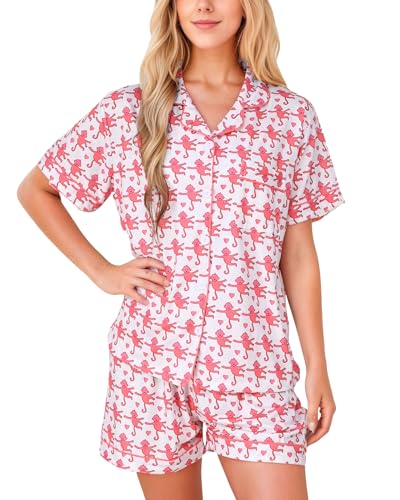 HMPEAIIY Women Y2k Pajamas Set Cute Preppy 2PCS Button Down Holiday Monkey Shorts Summer Outfit Beach Vacation Loungewear Pjs Sleepover Party Birthday Gift(Pink Monkey & Green Heart, X-Large)