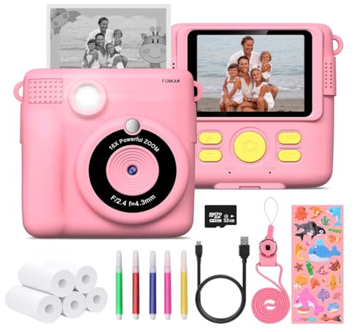 Instant Print Camera for Kids - 2.4" HD 1080P - with 32GB SD Card, 5 Markers, Stickers, 5 Paper Rolls, Lanyard. Camera Boys and Girls from 3 to 14 Years Old. (Pink)